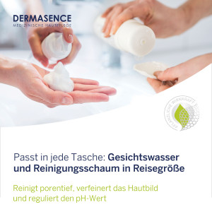 Das DERMASENCE Reiseset passt in jede Reisetasche. Die Kombination aus Mousse und Tonic reinigt porentief, verfeinert das Hautbild und reguliert den pH-Wert.