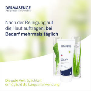 Die DERMASENCE Vitop forte Pflegecreme mit ihrem einzigartigen Wirkkomplex aus Färberwaid, Aloe vera und grünem Tee eignet sich ideal zur Pflege von extrem trockener und beanspruchter Haut. Die Creme kann der Entstehung von Juckreiz und Entzündungen vorbeugen und Rötungen nachhaltig reduzieren. Ein atmungsaktiver, nicht fettender Schutzfilm schützt die Haut vor mechanischen Belastungen. Besonders geeignet ist die Creme auch zur therapiebegleitenden Pflege bei Neurodermitis. Der hautverträgliche Vitop-Komplex sorgt für eine wirksame Beruhigung und Vorbeugung von Entzündungssymptomen bei regelmäßiger Anwendung. Die Pflegecreme ist natürlich, Farbveränderungen sind möglich. Dermatologisch getestet.