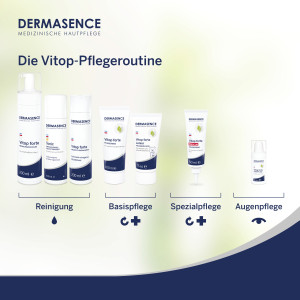 Pflegetipp: Als Akutpflege zur intensiven Beruhigung besonders gereizter Hautstellen im Gesicht und am Körper empfehlen wir die DERMASENCE Vitop forte Rescue Pflegecreme. Diese kann bei Bedarf auch mehrmals täglich aufgetragen werden. Für die gereizte Augenpartie empfehlen wir die DERMASENCE Vitop forte Augenpflege.
