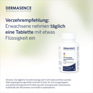 DERMASENCE H³ Komplex: Tabletten zur effektiven Nahrungsergänzung. Dieser Komplex wirkt sich positiv auf den Stoffwechsel von Haut, Haaren und Nägeln aus. Die ideale Kombination aus Vitaminen, Mineralstoffen und Spurenelementen unterstützt den täglichen Bedarf. Die Tabletten sind frei von Laktose und tierischen Inhaltsstoffen sowie Konservierungsmitteln.