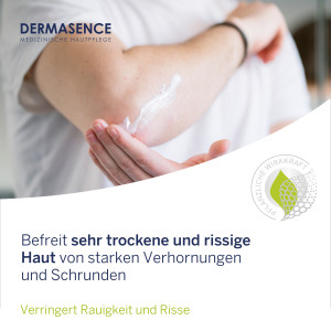 Die DERMASENCE Mycolex Schrundencreme ist eine Spezialpflege für sehr trockene, rissige Haut und Schrunden. Der hohe Ureaanteil von 40% löst die oberste Hautschicht an und befreit von starken Verhornungen, wodurch Schrunden und Rauigkeiten verringert werden und die Haut geglättet wird. Durch den Einsatz von Glycerin wird die Hautfeuchtigkeit erhöht. Die Creme eignet sich auch zur Reduzierung stark verhornter Areale und zeigt bereits nach 14-tägiger regelmäßiger Anwendung eine deutliche Verbesserung des Hautzustandes. Die Schrundencreme ist parfümfrei und dermatologisch getestet.